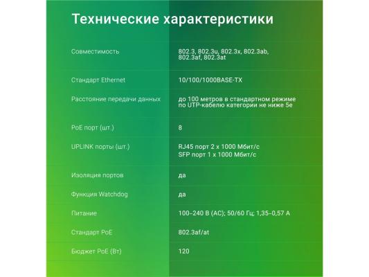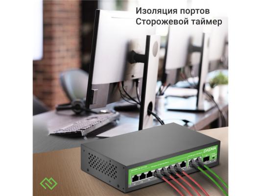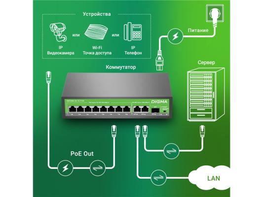Коммутатор Digma DSP208G-2G-1S-T120 (L2) 10x1Гбит/с 1SFP 8PoE 8PoE+ 120W неуправляемый